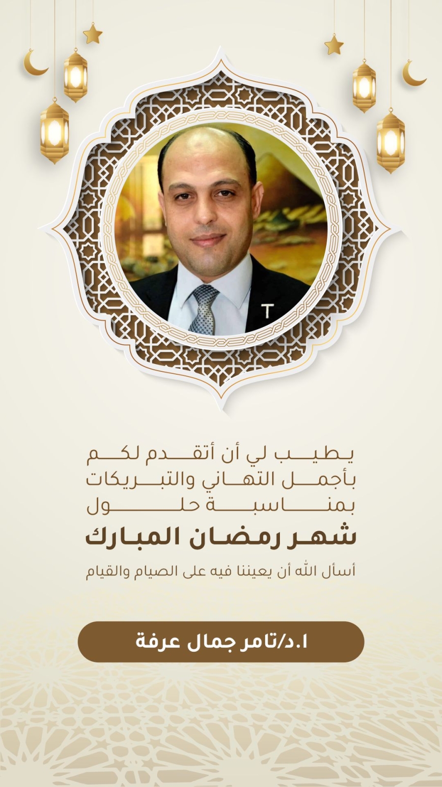 يتقدم الأستاذ الدكتور/ تامر جمال عرفة، القائم بعمل عميد كلية علوم الرياضة جامعة بنها، والسادة الوكلاء، بأحر التهاني إلى طلاب الكلية والسادة أعضاء هيئة التدريس والجهاز الإداري بمناسبة حلول شهر رمضان المبارك، متمنين لهم صيامًا مقبولًا وذنبًا مغفورًا.