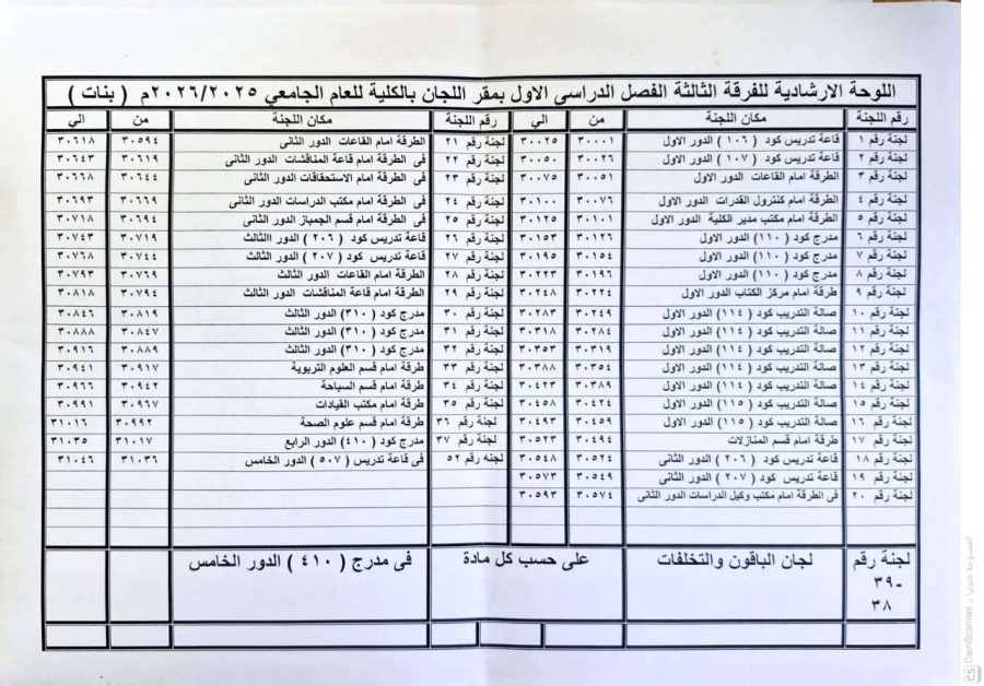 اللوحة الارشادية للفرقة الثالثة بنات للفصل الدراسي الاول للعام الجامعى 2026/2025م