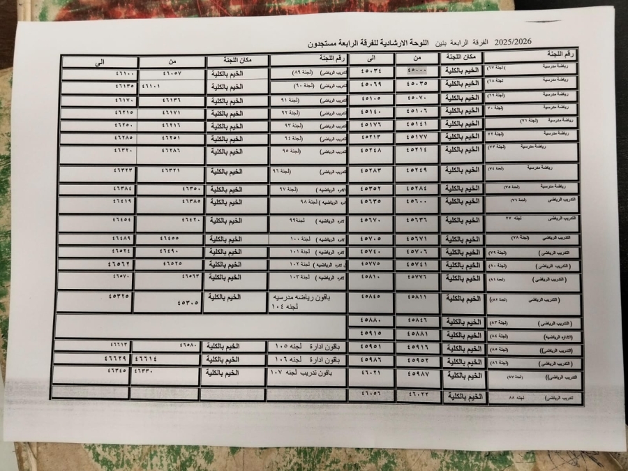 اللوحة الارشادية للفرقةالرابعة  بنين للفصل الدراسي الاول للعام الجامعى 2026/2025م