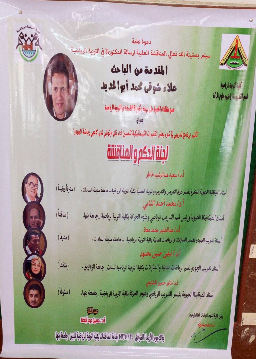 سيتم بمشيئة الله تعالى مناقشة رسالة الدكتوراة  للباحث / علاء شوقى محمد أبو الحديد تحت عنوان / تأثير برنامج تدريبي فى ضوء بعض المتغيرات الكينماتيكية   لتحسين  اداء تاي اوتوشي لدى لاعبى  رياضة الجودو وذلك يوم الأربعاء الموافق 2017/5/24 بقاعة المناقشات بكلية  التربية الرياضية بنها.