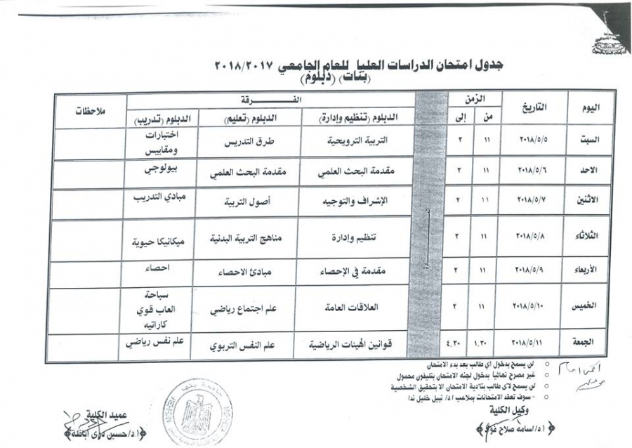 جدول امتحان الدراسات العليا للعام الجامعى 2018/2017 ( بنات ) ( دبلوم)