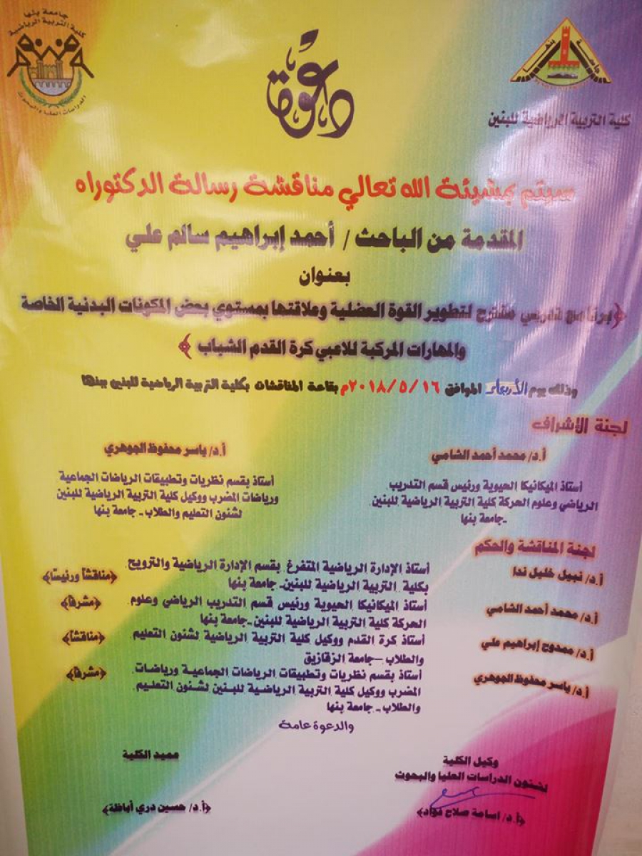 مناقشة رسالة الماجستير بعنوان (برنامج تدريبي مقترح لتطوير القوة العضلية وعلاقتها بمستوى بعض المكونات البدنية الخاصة والمهارات المركبة للاعبي كرة القدم الشباب )