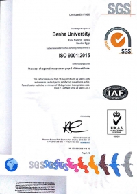 تسلمت جامعة بنها اليوم شهادة الأيزو 9001- لسنة 2015 من شركة sgs السويسريه، كأول جامعه مصريه تحصل عليها، صرح بذلك الدكتور السيد يوسف القاضي رئيس الجامعه