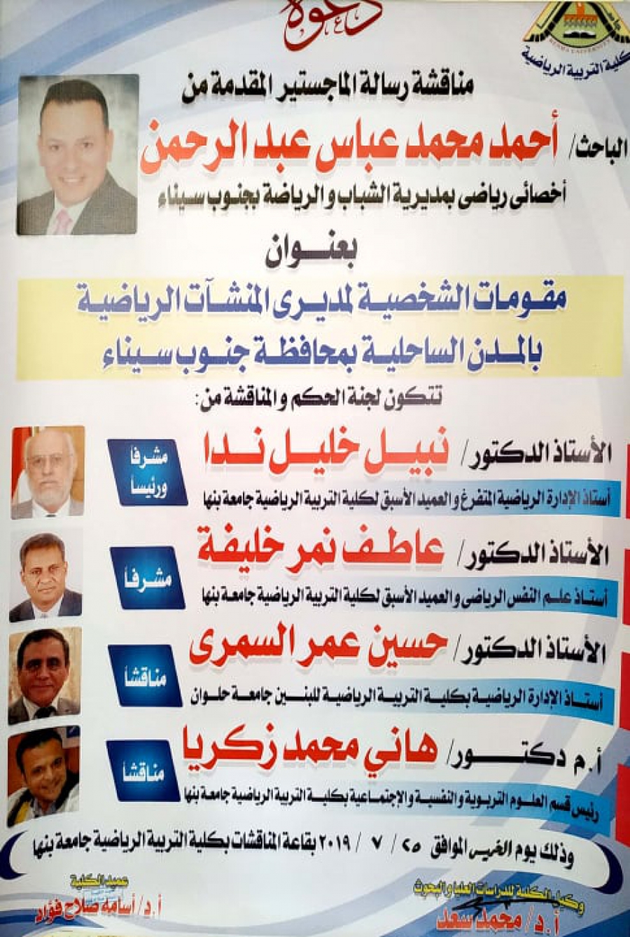 بعنوان / مقومات الشخصية لمديري المنشآت الرياضية بالمدن الساحلية بمحافظة جنوب سيناء
