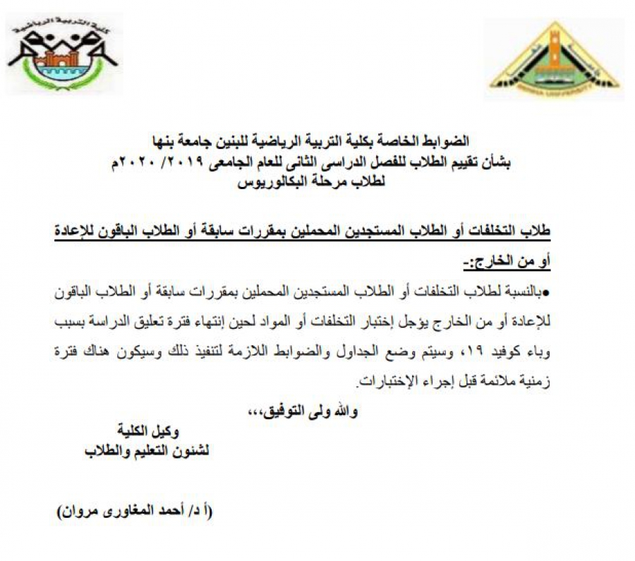 يمتحن الطالب فى هذة المقررات بعد إنتهاء تعليق الدراسة ويرصد له درجة وتقدير وفقا للقانون واللوائح المنظمة.