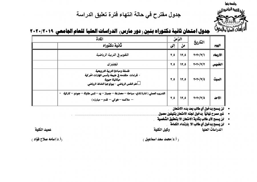 جدول امتحانات الدراسات العليا ثانية دكتوراة بنيين دور مارس للعام الجامعى 2019/2020