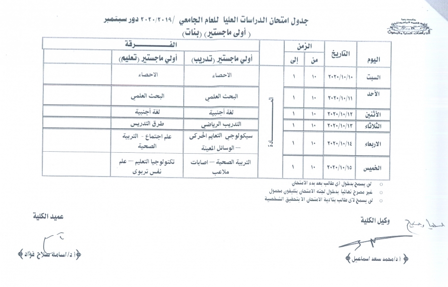 جدول امتحان الدراسات العليا للعام الجامعى 2020/2019م بنات اولى ماجستير دور سبتمبر