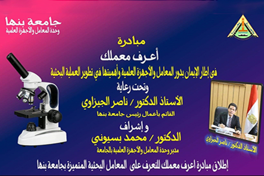 أطلقت وحدة المعامل والأجهزة العلمية بجامعة بنها مبادرة «أعرف معملك» برعاية الدكتور/ ناصر الجيزاوي - القائم بأعمال رئيس جامعة بنها، وأشراف الدكتور / محمد بسيوني - مدير وحدة المعامل والأجهزة العلمية بالجامعة.