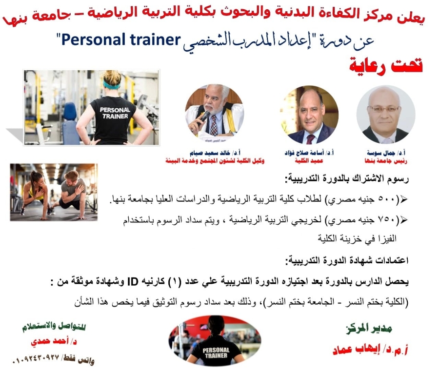 يتشرف مركز الكفاءة البدنية والبحوث بكلية التربية الرياضية – جامعة بنها بأن يفتح باب الاشتراك فى دورة ( اعداد المدرب الشخصي Personal Trainer ) PT ؛ كما أن الدارسين بالدورة سيحصلون على شهادة موثقة من ( كلية التربية الرياضية ؛ جامعة بنها ؛ وزارة الخارجية ) وكارنيه كومبيوتر بعد اجتياز الدورة مع العلم بأن الدورة ستتم في قاعات وصالات مكيفة بالكلية ، كما أن هناك محاضرات عملية وتطبيقية سيتم بثها مباشرة ، كما أن ألية الاشتراك بالدورة بالتوجة إلى الدور الاول غرفة 116 بالكلية الاستاذ / ضياء الفقي لإصدار أمر دفع ، ثم الذهاب الى خزينة الكلية لسداد الرسوم المقررة .