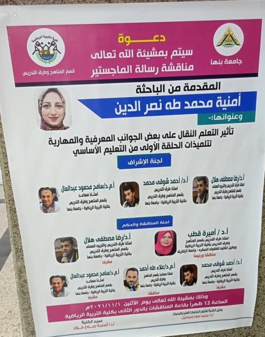 مناقشة رسالة الماجستير بعنوان ( تأثير التعلم النقال على بعض الجوانب المعرفية والمهارية لتليمذات الحلقة الاولى من التعليم الاساسي )