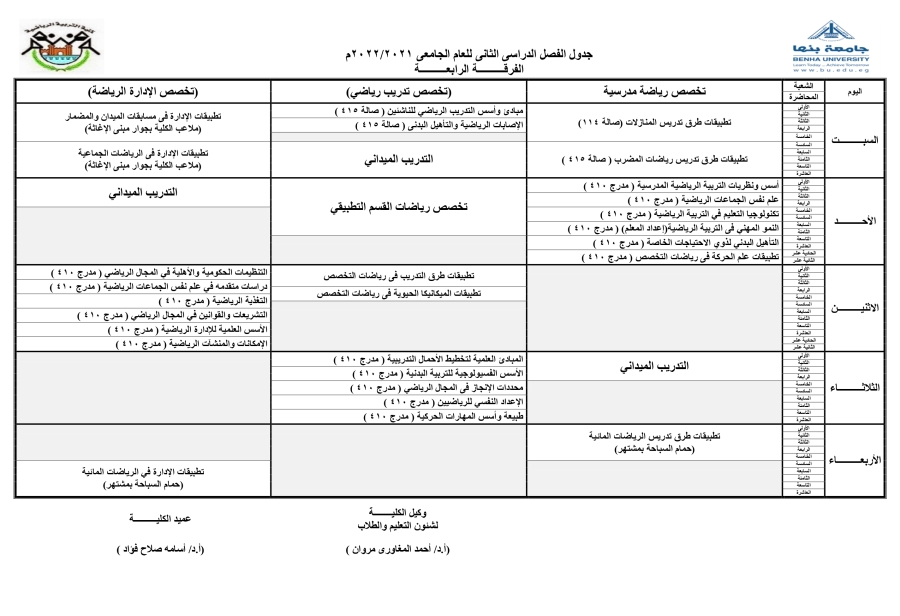 جدول الدراسي للفرقة الرابعة للفصل الدراسي الثانى للعام الجامعى 2021/2022م