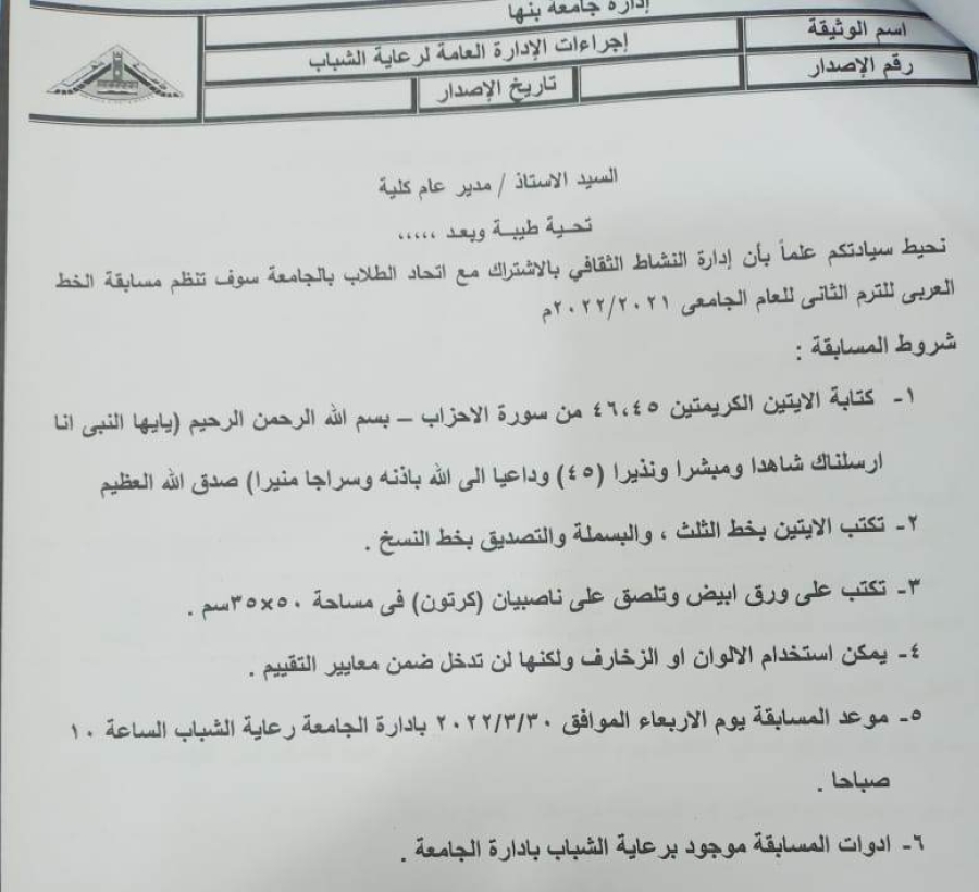 تنظم إدارة النشاط الثقافي برعاية الشباب بجامعة بنها بالاشتراك مع اتحاد الطلاب بجامعة بنها سوف تنظم مسابقة مسابقة الخط العربى الترم الثاني للعام الجامعي 2021/2022م