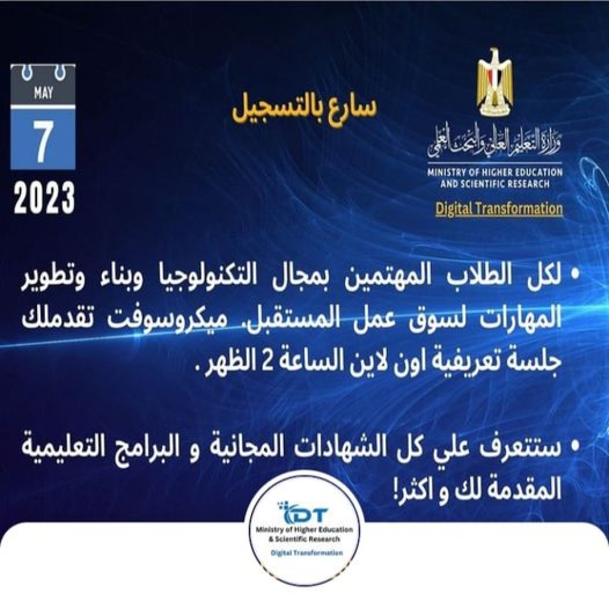 نتشرف بان نعلن لكل طالب و طالبة مهتمين بمجال التكنولوجيا ومتابعة كل ما هو جديد لكورسات تدريبية والتى يتم الإعلان عنها على قنوات التواصل الاجتماعى الرسميه للتحول الرقمى لوزارة التعليم العالى والبحث العلمى
