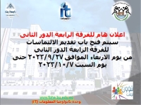 فتح باب تقديم الالتماسات للفرقة الرابعة الدور الثاني وذلك من يوم الاربعاء الموافق ۲۰۲۳/۹/۲۷ حتى يوم السبت ٢٠٢٣/١٠/٧