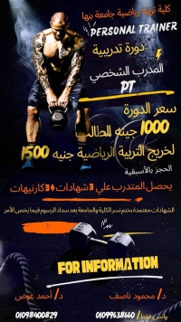 تتشرف كلية التربية الرياضية – جامعة بنها بأن تفتح باب الاشتراك فى دورة ( اعداد المدرب الشخصى + PT مدرب اللياقة البدنية CFT + مقنن الأحمال التدريبية ) كما أن الدارسين بالدورة سيحصلون على عدد ( 3 ) شهادات موثقة من ( كلية التربية الرياضية ؛ جامعة بنها ) قابلين للتوثيق من وزارة الخارجية وعدد ( 3 ) كارنيهات كومبيوتر مختومة بشعار الجمهورية مع العلم بأن الدورة ستتم في قاعات وصالات مكيفة بالكلية ، كما أن هناك محاضرات عملية وتطبيقية سيتم بثها مباشرة ، كما أن ألية الاشتراك بالدورة بالتوجة إلى الدور الثاني غرفة الاستحقاقات بالكلية ( أ/ إيمان مصطفى ) لإصدار أمر دفع ، ثم الذهاب الى خزينة الكلية لسداد الرسوم المقررة بالفيزا.
