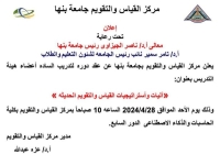 دوره لتدريب السادة أعضاء هيئة التدريس بعنوان  آليات وأستراتيجيات القياس والتقويم الحديثه »  وذلك يوم الأحد الموافق 2024/4/28 الساعه 10 صباحاً بمركز القياس والتقويم بكلية  الحاسبات والذكاء الاصطناعي الدور السابع.