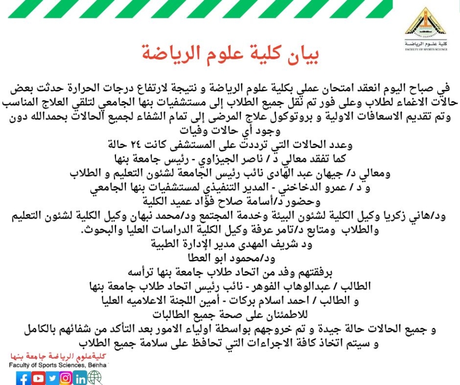 في صباح اليوم انعقد امتحان عملي بكلية علوم الرياضة و نتيجة لارتفاع درجات الحرارة حدثت بعد حالات الاغماء لطالبات وعلى فور تم نقل جميع الطالبات إلى مستشفيات بنها الجامعي لتلقي العلاج المناسب وتم تقديم الاسعافات الاولية و بروتوكول علاج المرضى إلى تمام الشفاء لجميع الحالات بحمدالله دون وجود أي حالات وفيات