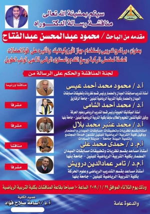 مناقشة رسالة الدكتوراه بعنوان (برنامج تدريبي باستخدام جهاز الايزوكينتيك وتأثيره على قوة العضلات العاملة لمفصلي الركبة ورسغ القدم والمستوى الرقمي للاعبى الوثب الطويل )