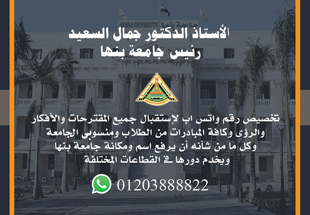 خصص الدكتور جمال السعيد رئيس جامعة بنها خدمة «الواتس آب» على رقم «01203888822» لسرعة التواصل مع الطلاب وجميع منسوبى الجامعة وكلياتها على مدار الساعة.